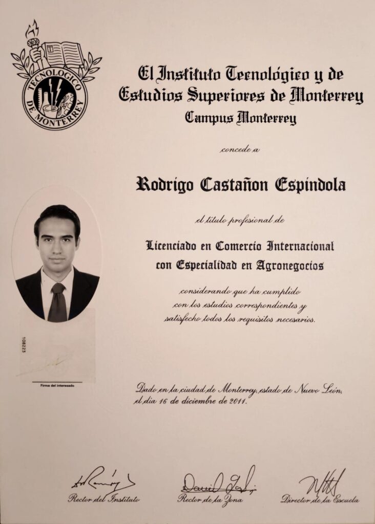 Graduado del Tec de Monterrey, como Lic. en comercio internacional con especialidad en agronegocios.